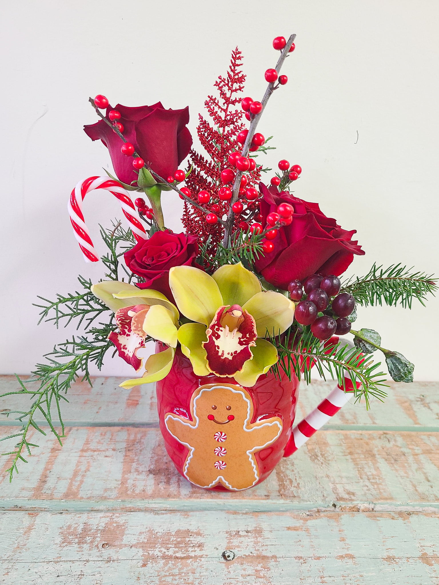 A bright festive arrangement made with fresh seasonal greens, roses and topped with beautiful orchid blooms.