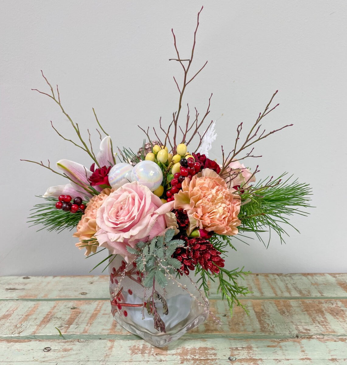 This contemporary Christmas piece is inspired by lead designer Erin’s love of hiking through BC’s beautiful forests. With a combination of delicate roses, carnations, cedar sprigs and festive ornaments this is the perfect modern holiday arrangement.