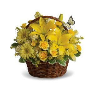 A-ticket, a-tasket, a happy yellow basket! New wishes for a new baby. A ribbon detail will be added for a boy or girl