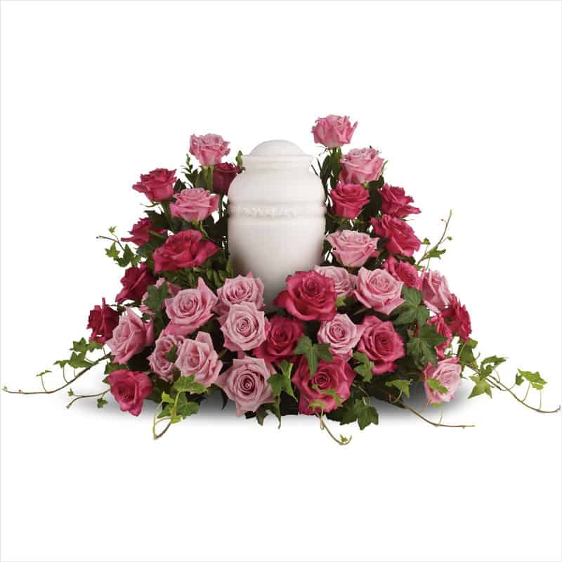 A wealth of pink roses create a soft, serene and dignified way to cherish and honour the departed.