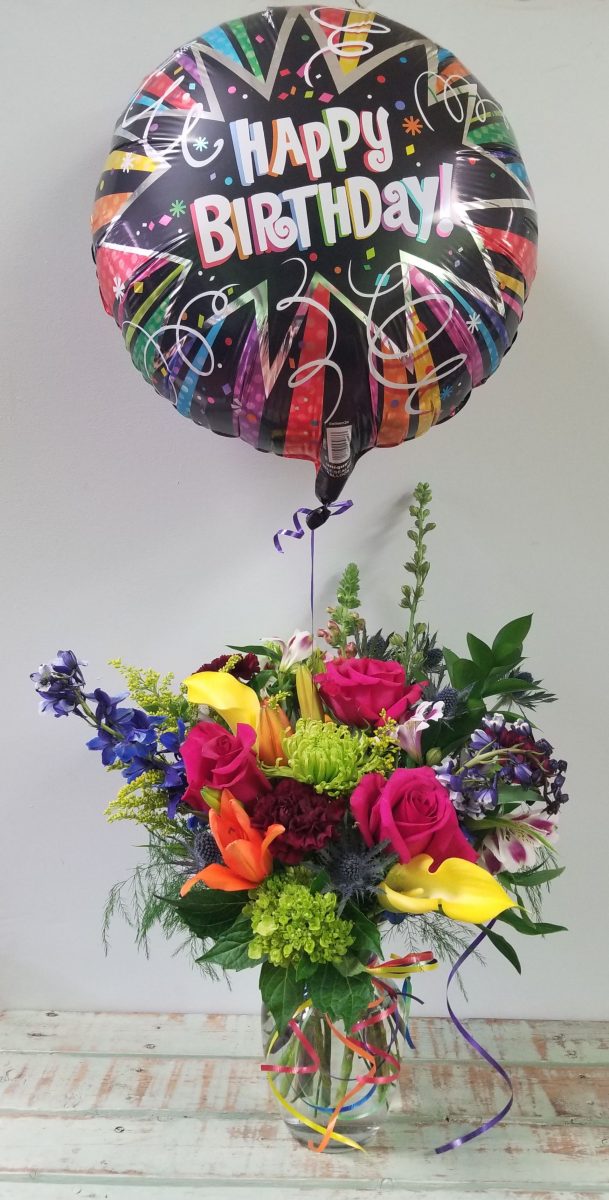 Celebrate a special day with a vase of seasonal flowers and a mylar birthday balloon.