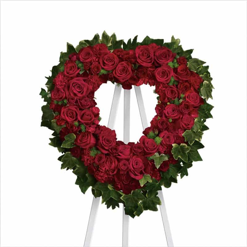 A beautiful heart is a wonderful way to share your thoughts of love. Red roses, spray roses, carnations and miniature carnations are arranged with fern and ivy in the shape of a heart.