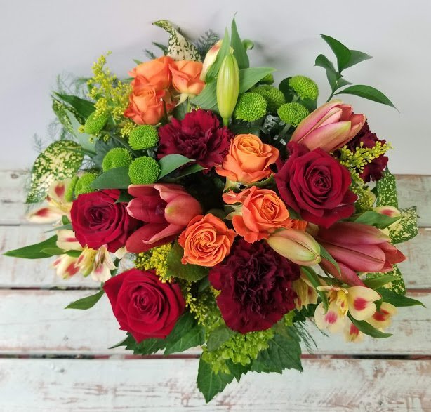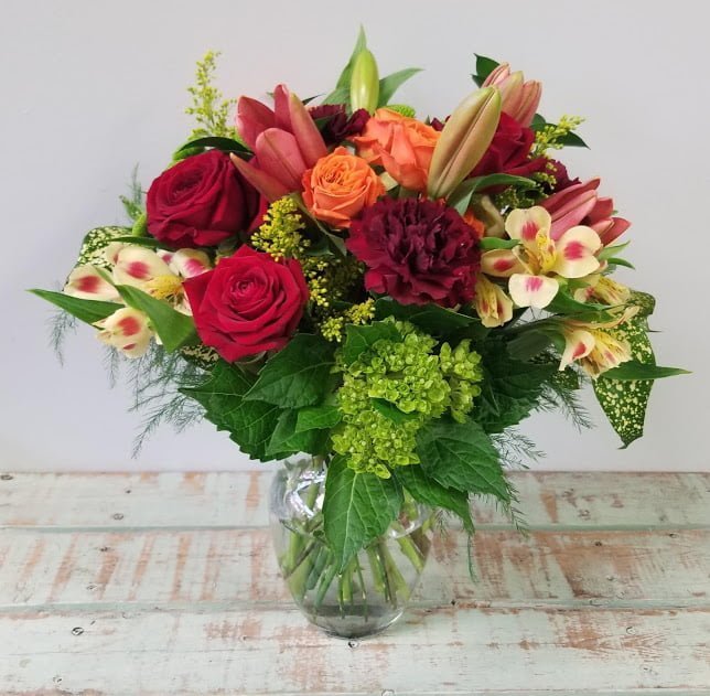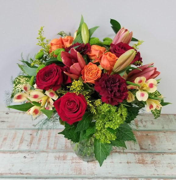 Spread warmth and joy with a vase arrangement of red, orange and burgundy tones