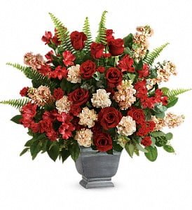 A bold expression of your deepest condolences, this elegant mix of red and peach blooms brings strength and comfort. Approximately 26 1/2″ W x 25″ H