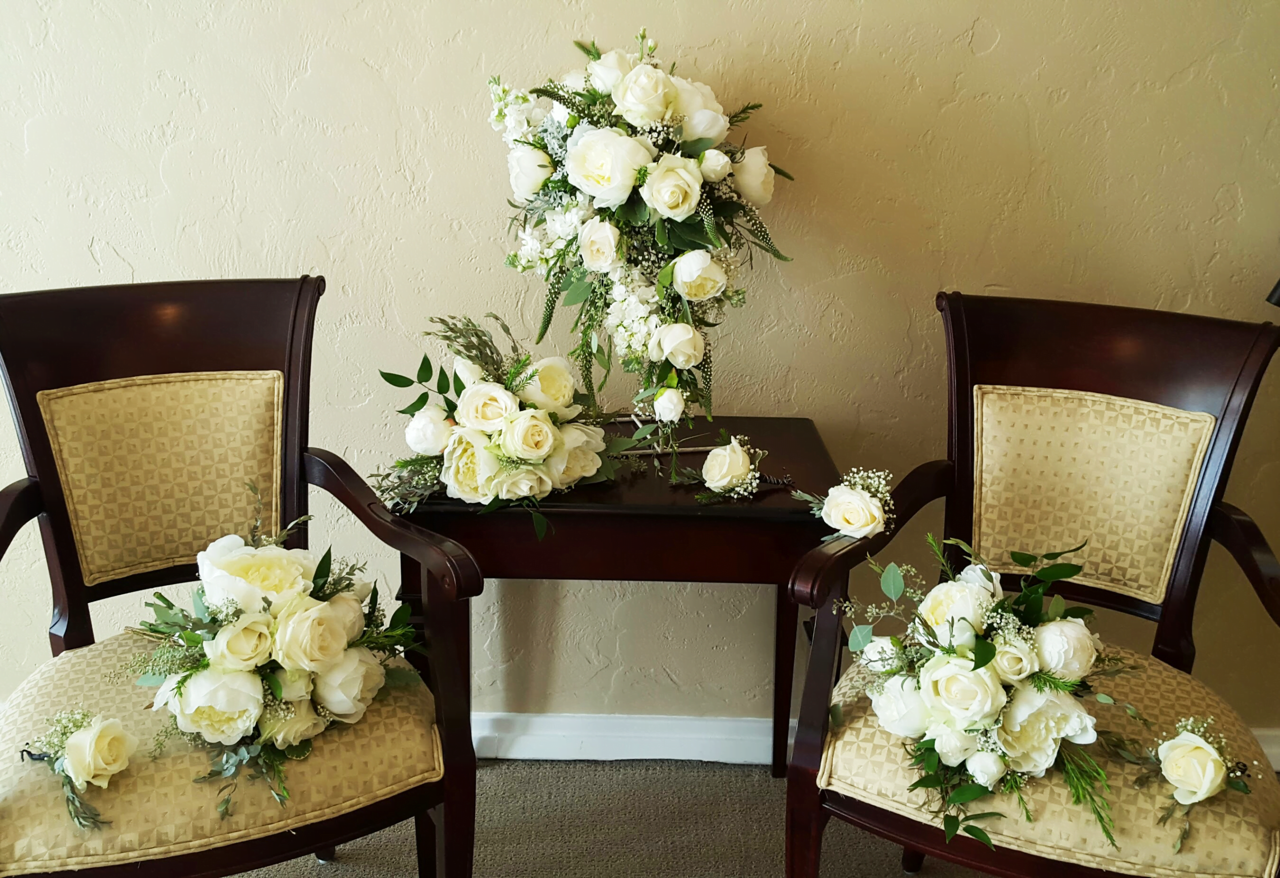 Bridal bouquet + 2 bridesmaid bouquets + Groom boutonniere + 2 Groomsmen boutonnieres)