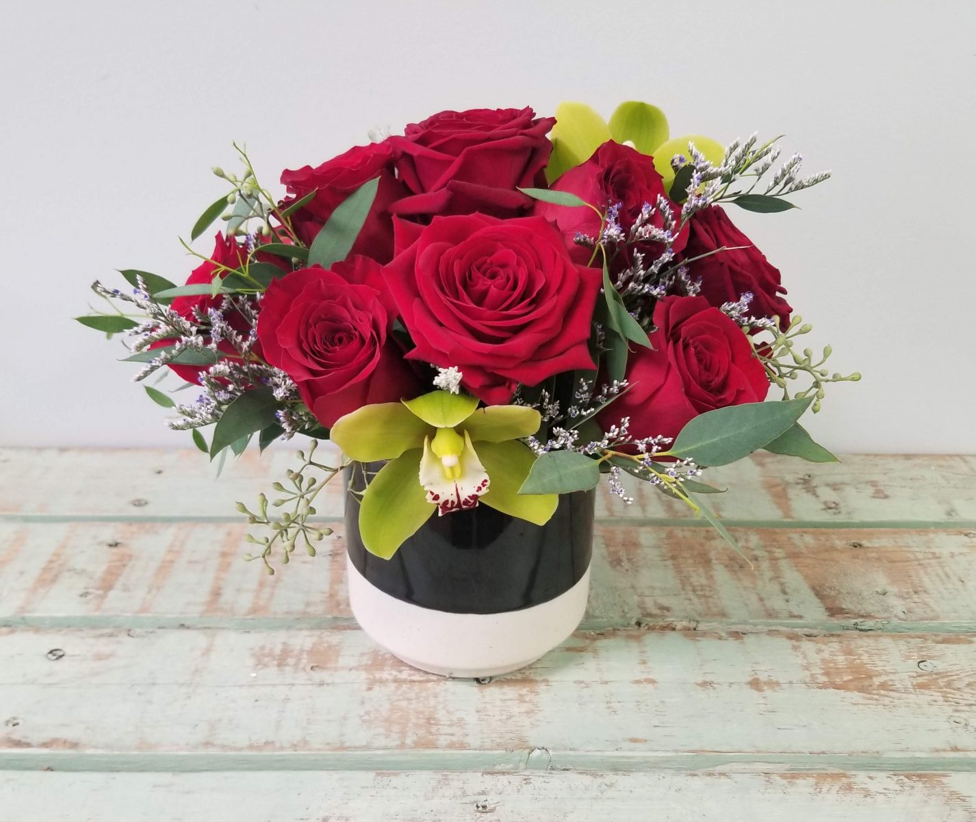 The sun is up, the sky is blue, it’s beautiful – and so are you. A dozen red roses with orchid accents nestled in a ceramic container