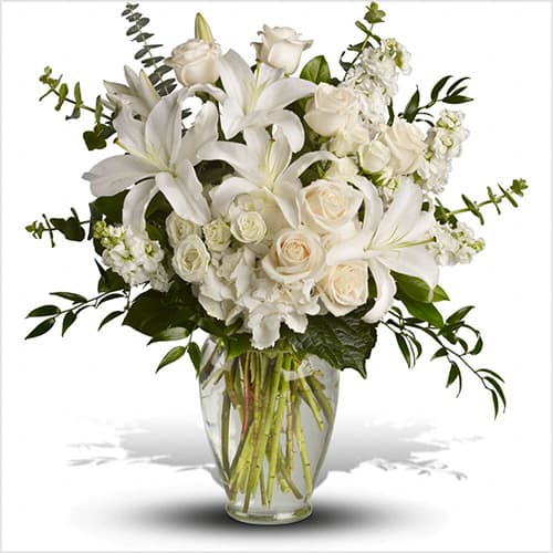 A lovely bouquet to soothe and comfort, a variety of white and peach blossoms sends your hope and strength. Beautifully.