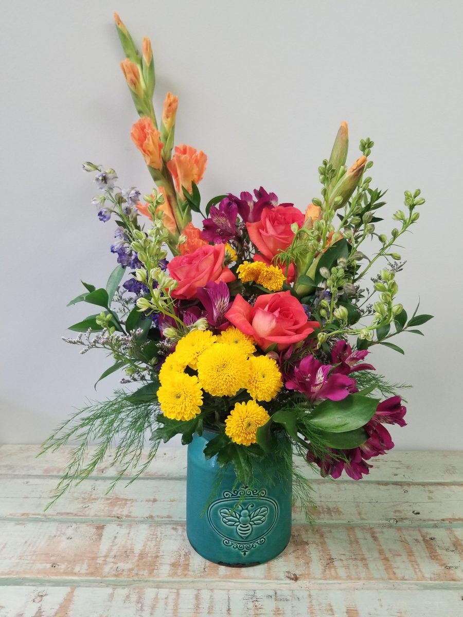 One of the most fun and eclectic neighbourhoods in Victoria is Fernwood. With it’s brightly colored houses, murals and telephone pole art, there is so much to see. This arrangement is filled with funky bright seasonal flowers.