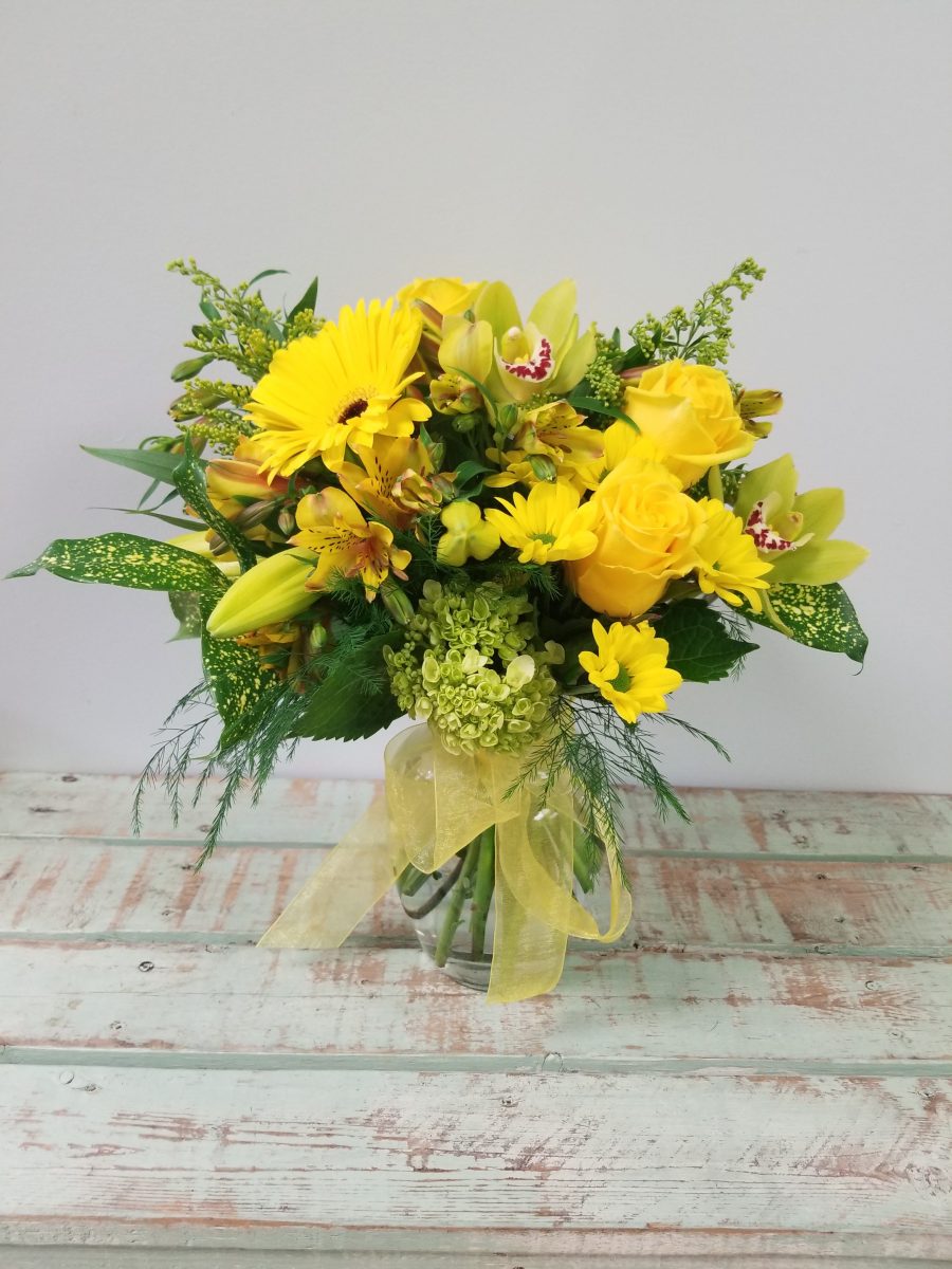 a cheerful vase of sunny yellow blooms, sure to brighten anyone’s day