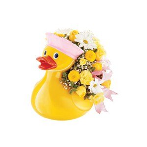 Welcome the new baby to the flock with flowers in a wonderfully whimsical ceramic duck that becomes a cute container for shampoo and other things to keep baby neat and sweet.
