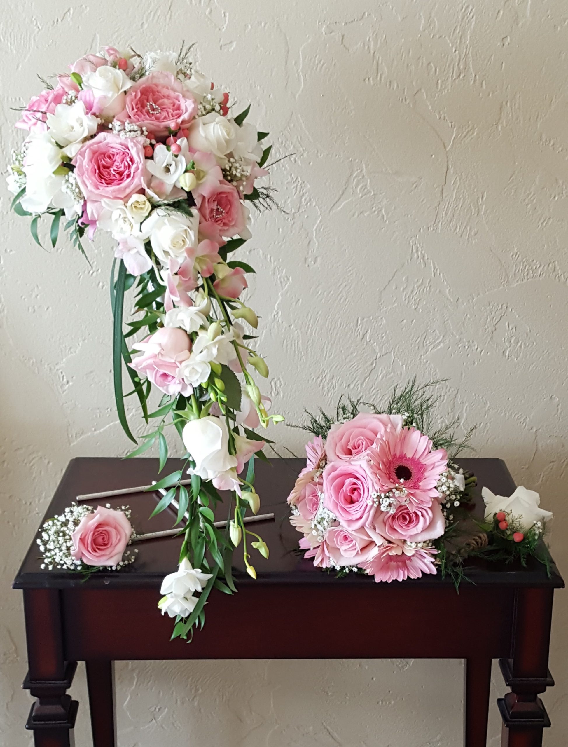 Bridal bouquet + Boutonniere/corsage + 2 boutonnieres or corsages for your witnesses.