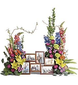 An awe-inspiring accent for your beloved photos at the service, this lush rose, lily and delphinium bouquet reflects a colorful life full of radiant memories. Arrangement does not include picture frame. Approximately 40″ W x 33 1/2″ H