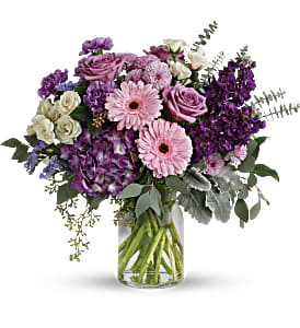 Deep purple, delicate lavender and peaceful pink create a warm bouquet to honour the memory of a loved one.