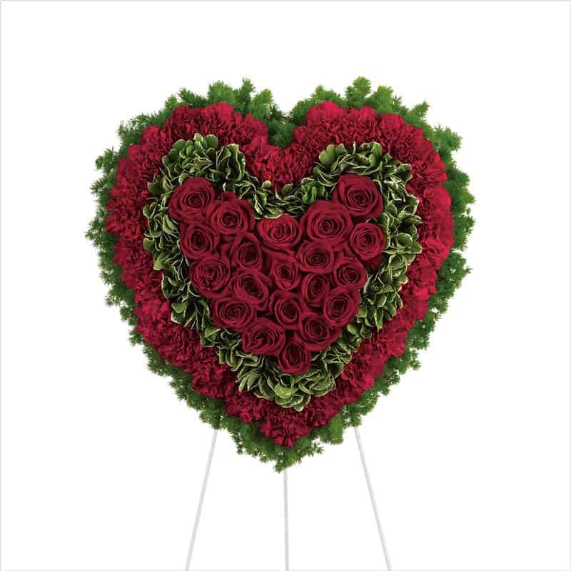 Remember a loved one’s generous heart with this red arrangement in a classic heart shape, a declaration of eternal love and devotion. Solid red roses matched with deep red carnations are surrounded by variegated greens and fern.