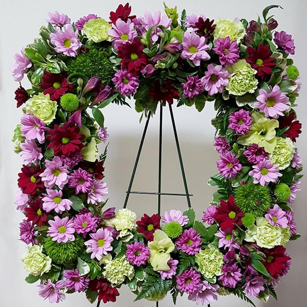 A unique and lovely tribute for the service, this contemporary square easel wreath of purple and green flowers is a gift of caring expressed with beauty and style.