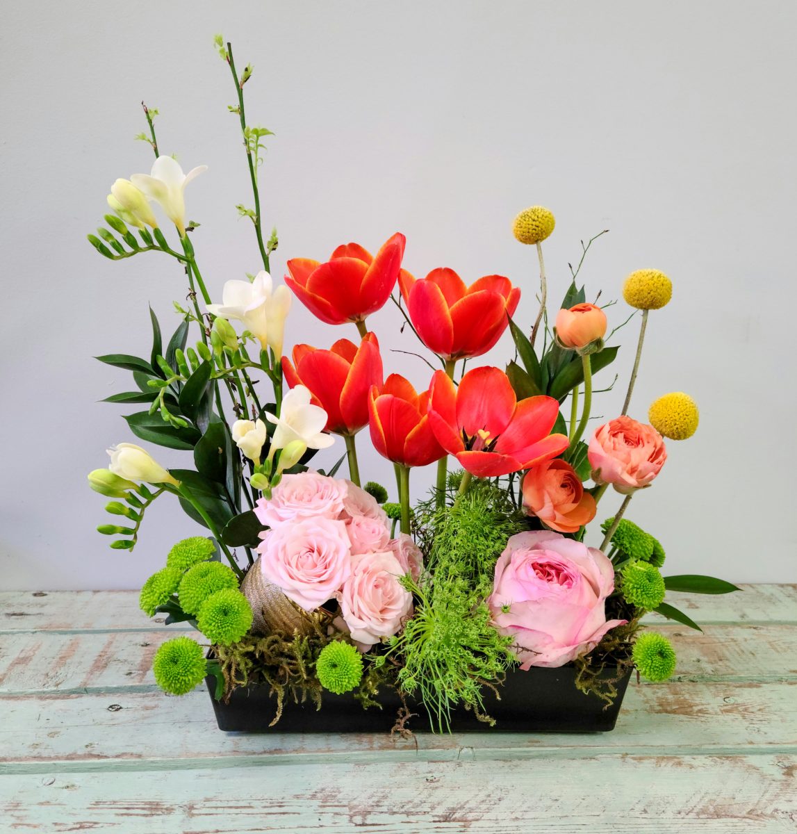 Pastel roses, bright blooms and elegant stalks contrast perfectly with verdant greens giving this arrangement the appearance of being freshly picked from mythic gardens.