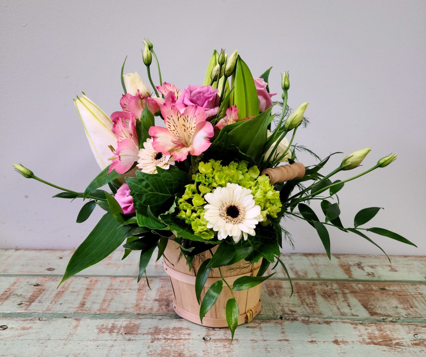 This adorable arrangement of fragrant lilies, fresh greens and, bright blooms reminds me of helping my mom in her garden when I was a child.