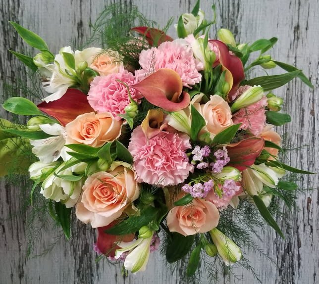 Peach, white and pink blooms create this stunning hand tied cut bouquet. Presented in beautiful wrap for delivery.