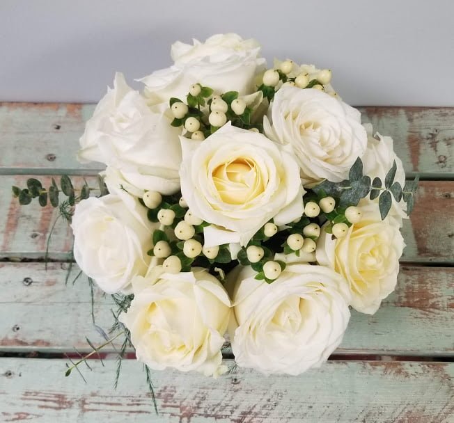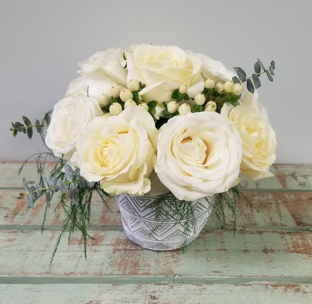 Simple, structured, and elegant. A collection of exquisite white roses are the highlight of this design; accompanied with thoughtful touches of greenery