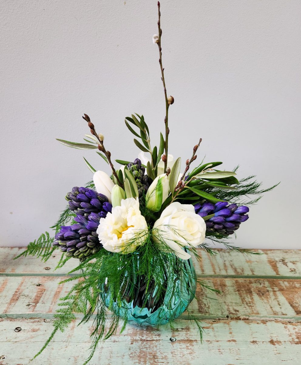 As delicate as a quiet spring morning. This beautiful arrangement of luscious greens and seasonal blooms is presented in an exquisite glossy aquamarine vase.