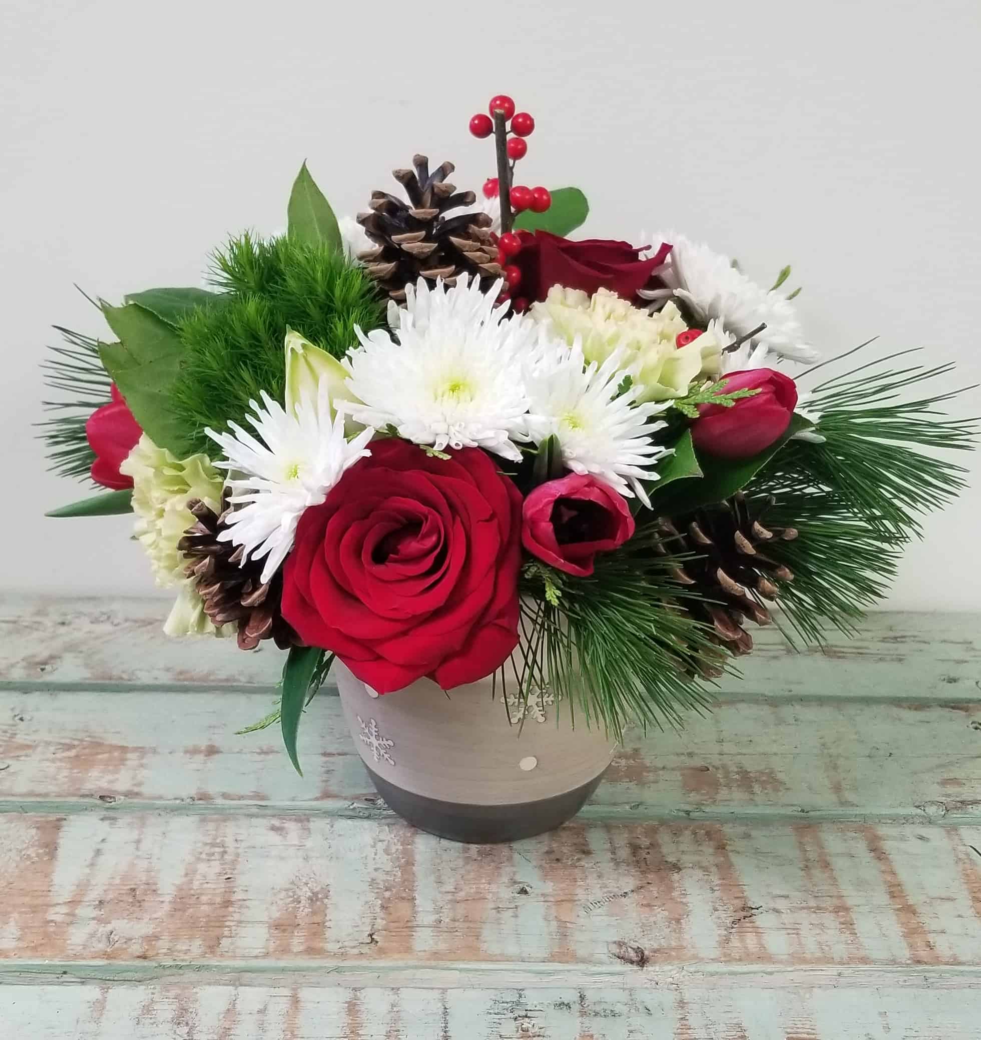 Elements of the season are thoughtfully gathered into a festive container. Your arrangement will arrive with a unique mix of blooms in holiday tones.