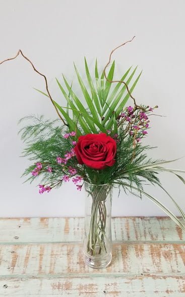Timeless and classic. A single rose in the colour of your choice presented in a glass vase with verdant greens.