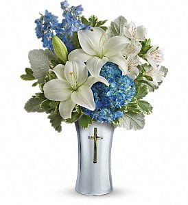 As hopeful as a bright blue sky, this beautiful arrangement of lush blue hydrangea and fragrant white lilies is a heartfelt symbol of peace and beauty. Its reverent, silver-finished ceramic vase with cross cut-out will remain a guiding light to your loved ones for years to come.