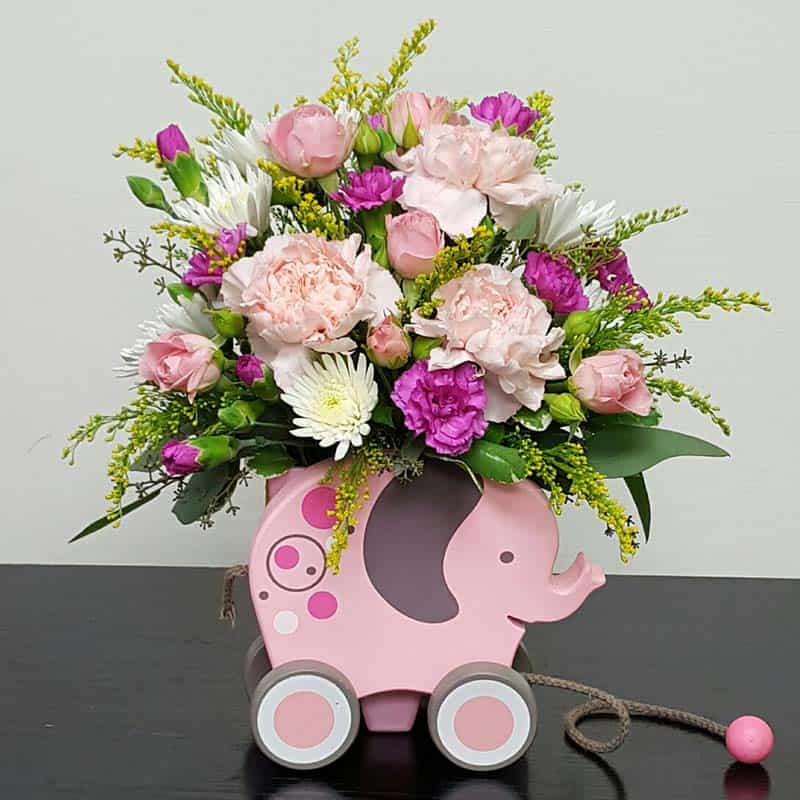 Give a baby girl her first trunk show with this stylish, not to mention adorable, arrangement. Beautiful flowers are delivered in a cute-as-a-button pink baby elephant. The wooden elephant is a toy with turning wheels!