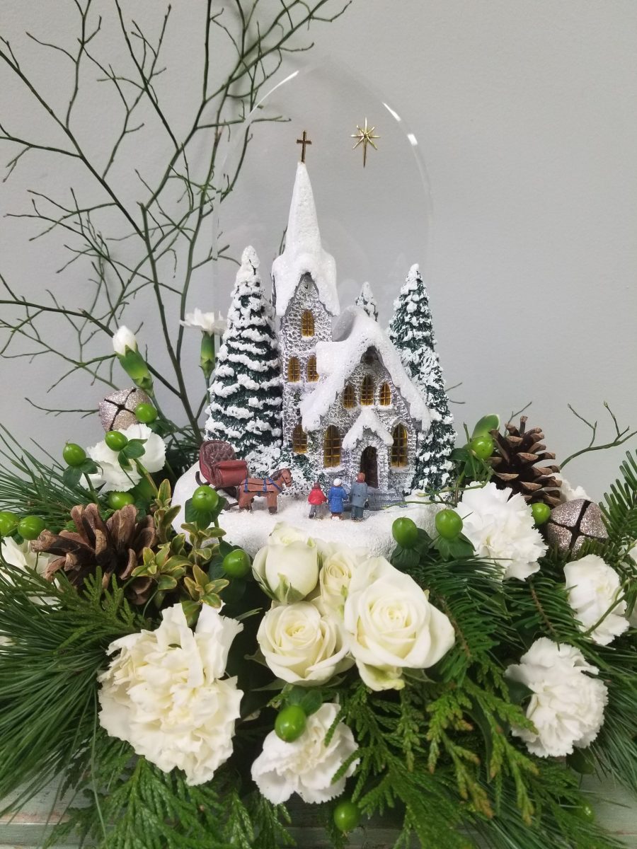 A beautiful arrangement filled with white roses and festive greens which comes with a light up Thomas Kinkade collectable nestled in the middle.