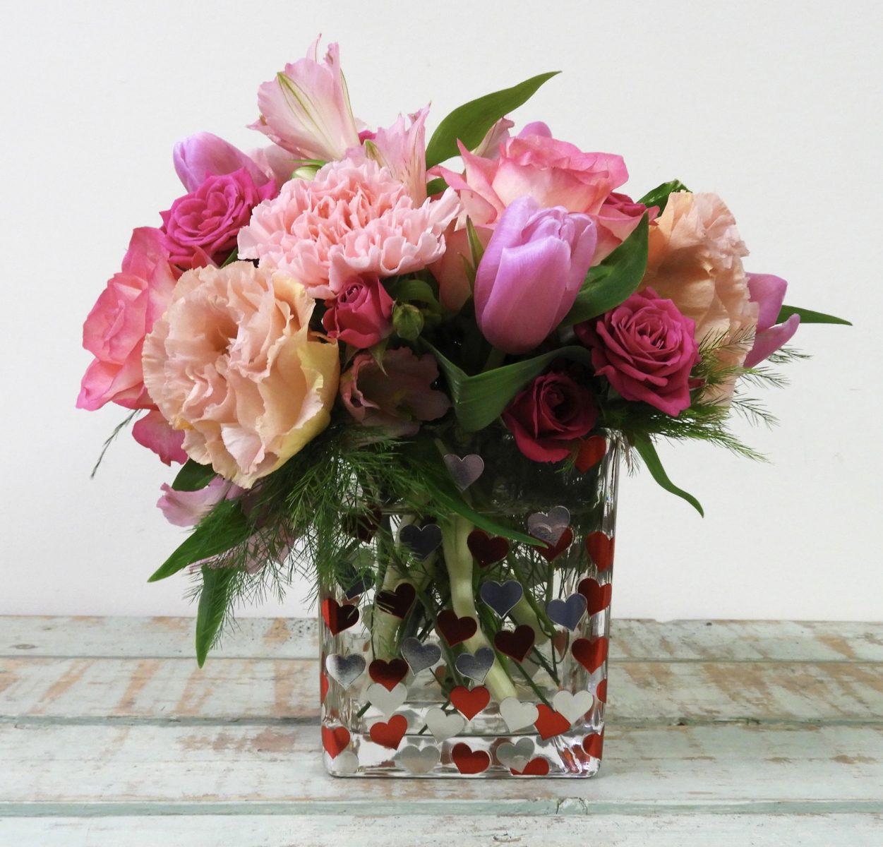 This adorable arrangement is the perfect addition to any date night. Hand-selected pink blooms expertly arranged in a cube-vase will make anyone feel tickled pink!