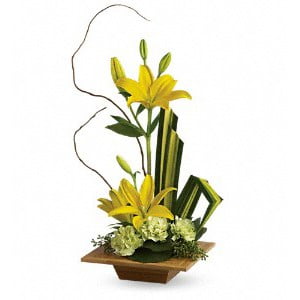 Stunning tiger lilies with carnations presented in a modern design with tropical leaves.