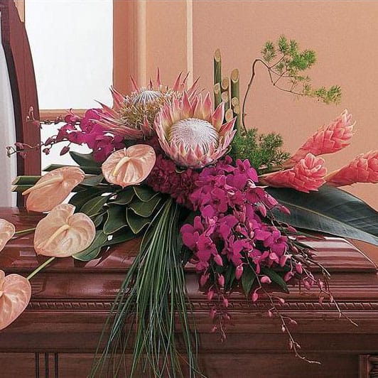 This gorgeous spray with its vibrant tropical flowers, says what words cannot. One half-couch casket spray arrives styled with pink and purple anthuriums and ginger, fuchsia dendrobium orchids and exotic protea, along with tropical foliage.