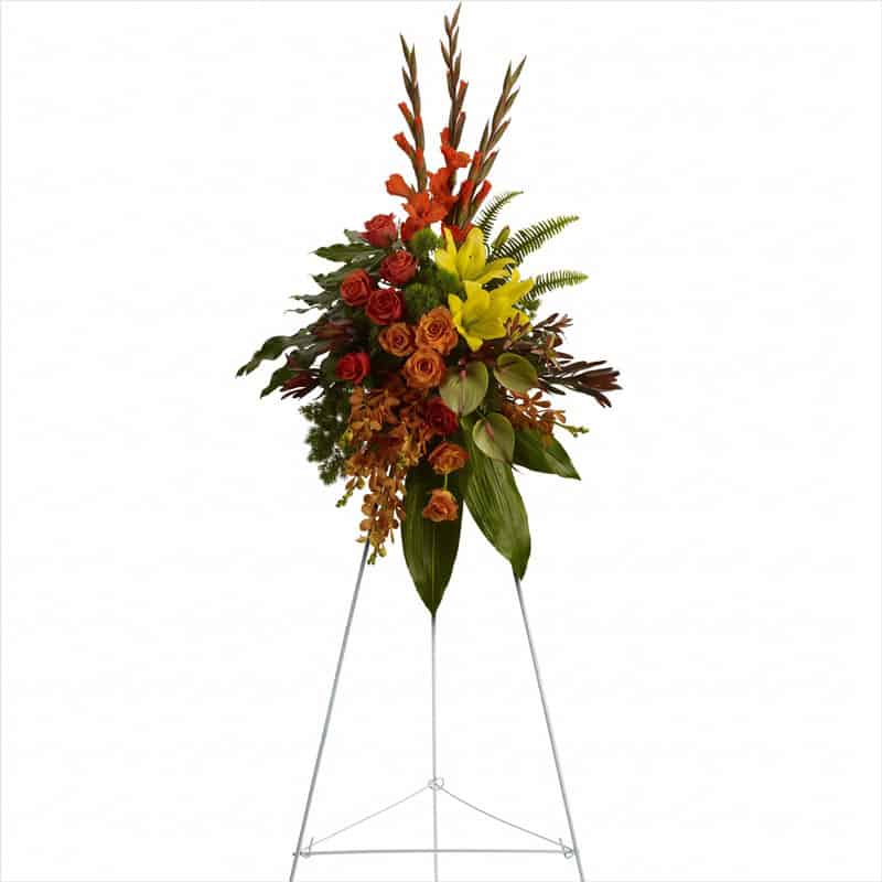 Tropical highlights balance with lush earth tones to offer hope and encourage reflection – a vivid spray that expresses deep and generous tribute.