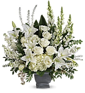 This pure white bouquet of hydrangea, roses and lilies offers hope and inspiration after the loss of a loved one. Approximately 28 1/2″ W x 30″ H