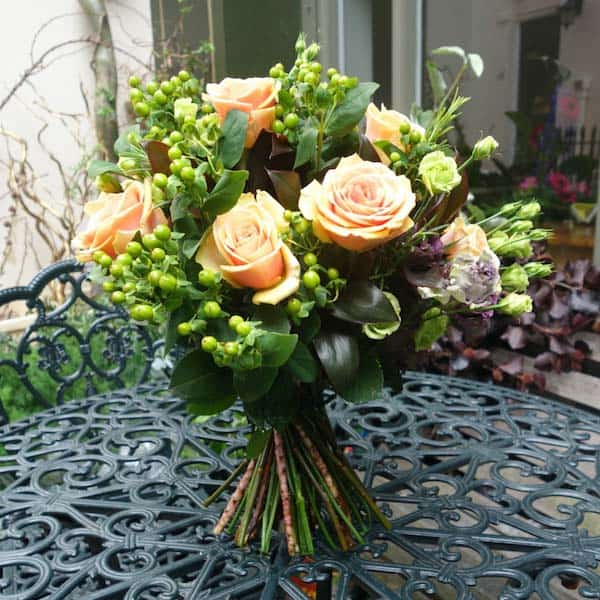 A stunning hand tied bouquet, seasonal colour roses combined with Hypericum and local greens