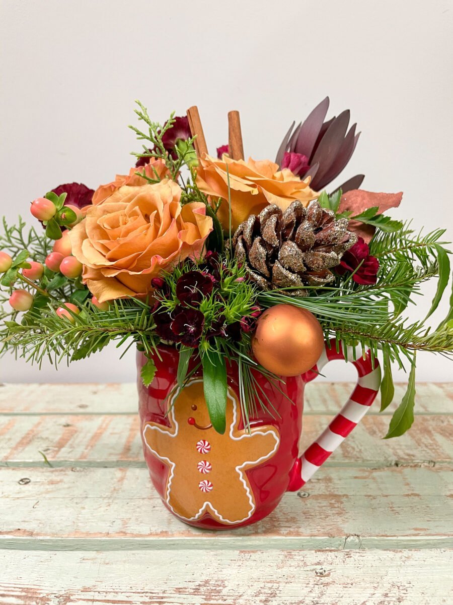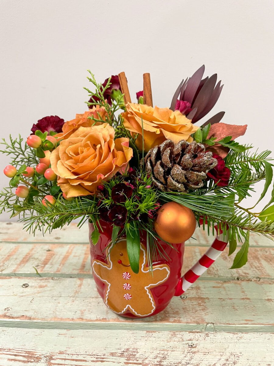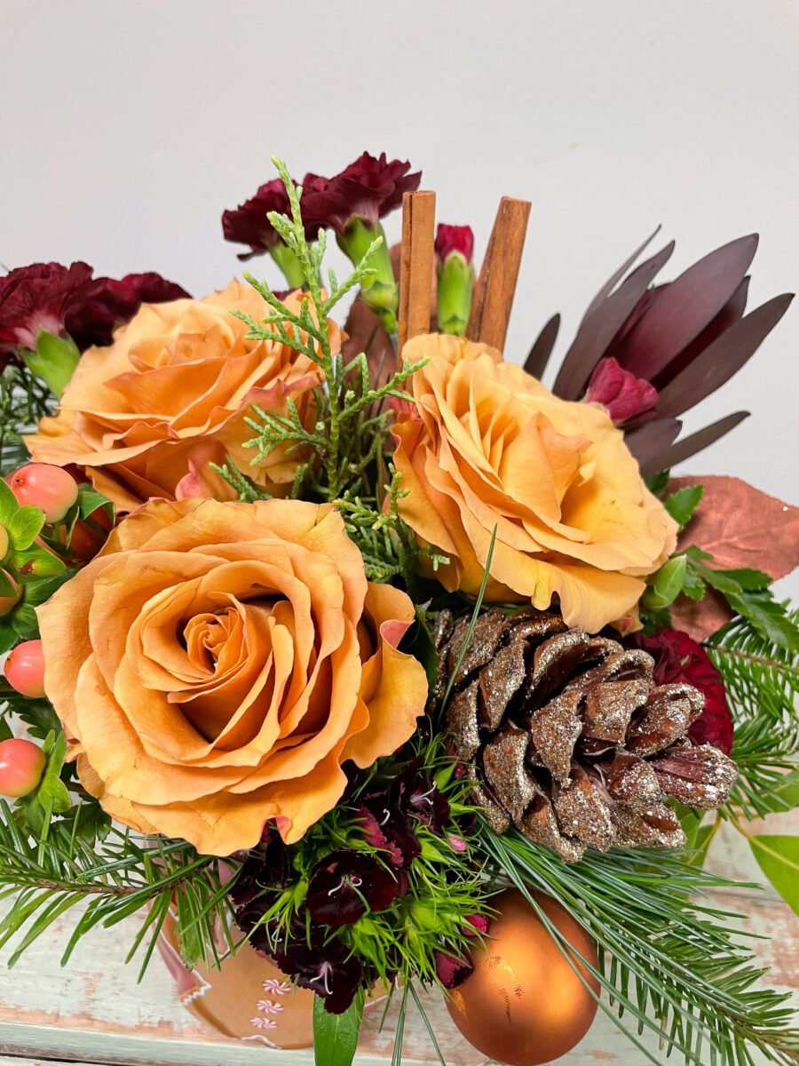This spicy and sweet blend of burnt-orange roses, fresh greens and real cinnamon sticks will leave you feeling warm and fuzzy!