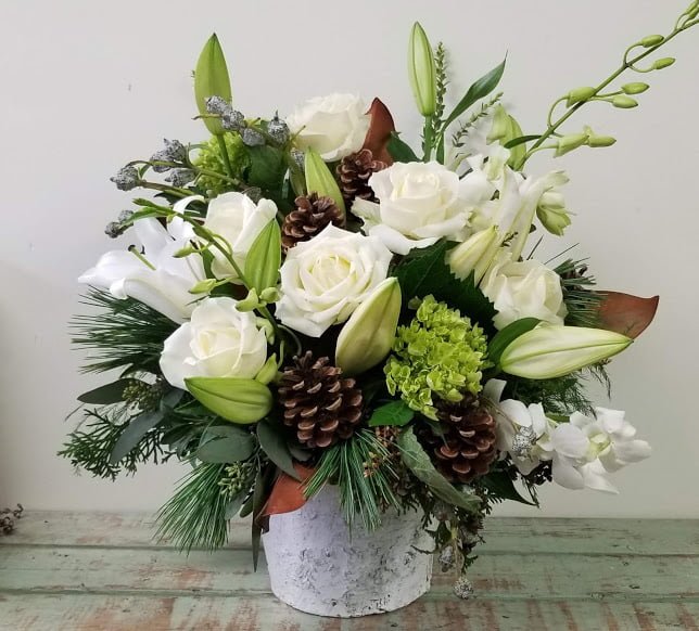 White blooms and West Coast elements create a woodsy design perfect for a Pacific Northwest winter